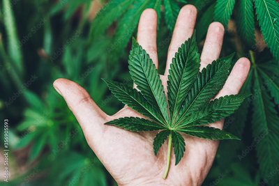 Young woman growing marijuana plants inside a farm - Cannabis medicine, healthy lifestyle and ecology concept - Focus on center part of the leaf