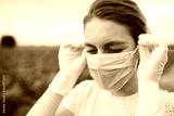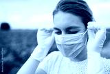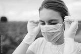young woman wears a virus protection mask and wears surgical sterile gloves on her hands