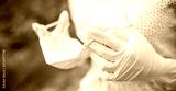 young woman wears a virus protection mask and wears surgical sterile gloves on her hands
