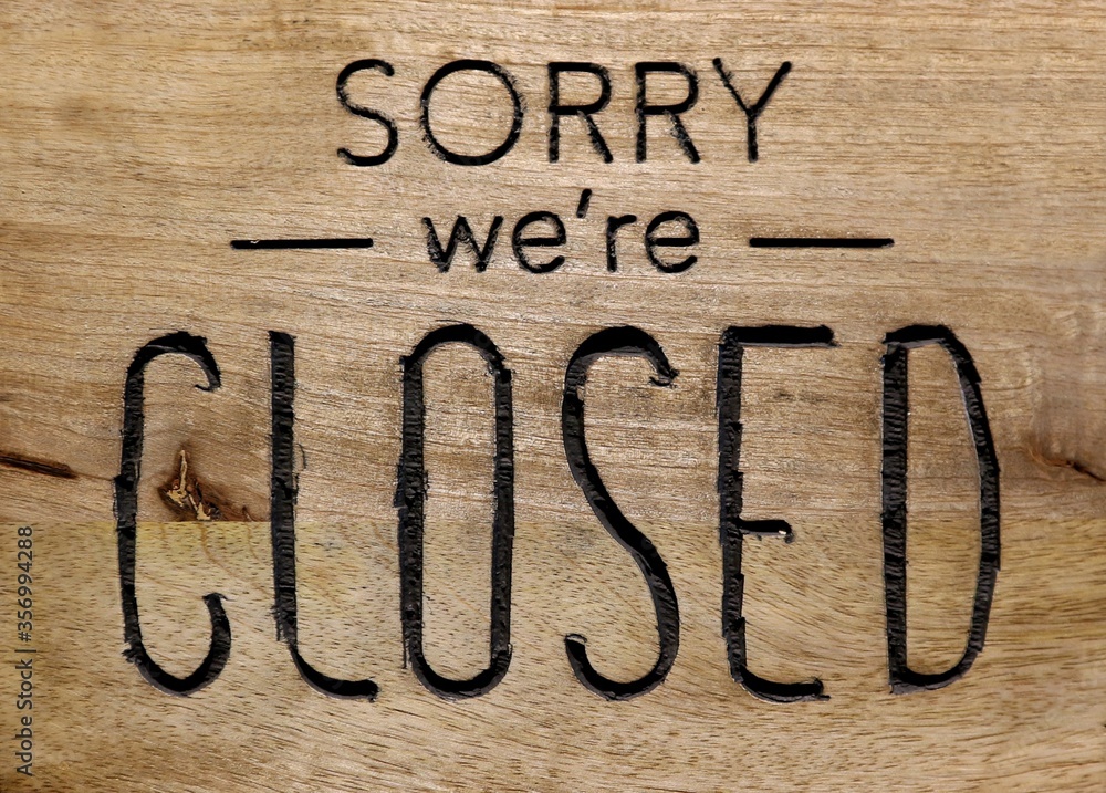 Sorry we're closed, information sign on wooden signboard in rustic style