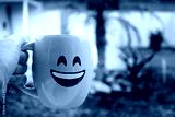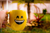 Mão segurando uma caneca de café com rosto sorrindo, lembrando um emoji. A cor da caneca é amarela e ao fundo há um jardim com palmeira e bromélias