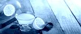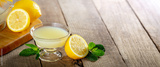Freshly Squeezed Lemon Juice In Small Glass Bowl On Wooden Table With Cutting Board