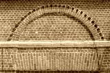 Ancient brick wall decorative elements, arch, semicircle. Red ancient brick building part.