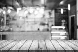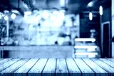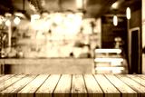Empty wooden desk space platform and blurred resturant or coffee shop background for product display montage.