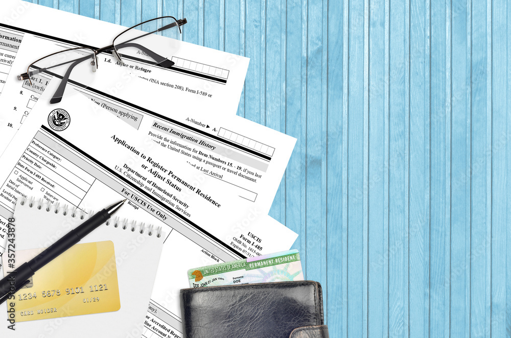 USCIS form I-485 Application to register permanent residence or adjust status lies on flat lay office table and ready to fill. U.S. Citizenship and Immigration services paperwork concept