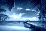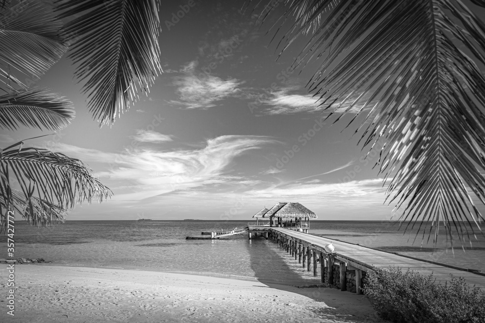 Black and white image of tropical beach. Exotic landscape in abstract black and white process. Luxury summer scenery, artistic view