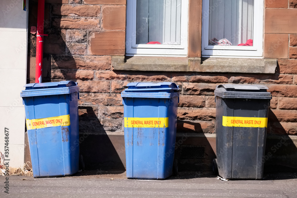Wheelie bin colour blue, green and black for refuge collection outside house in a row