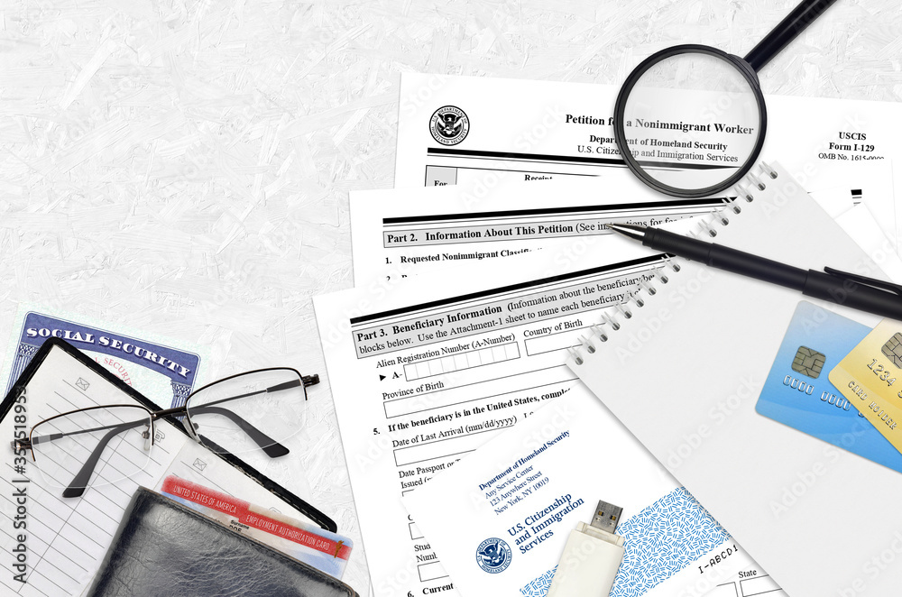 USCIS form I-129 Petition for a nonimmigrant worker lies on flat lay office table and ready to fill. U.S. Citizenship and Immigration services paperwork concept