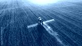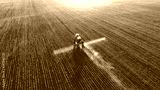 Tractor spray fertilizer on green field drone high angle view, agriculture background concept.