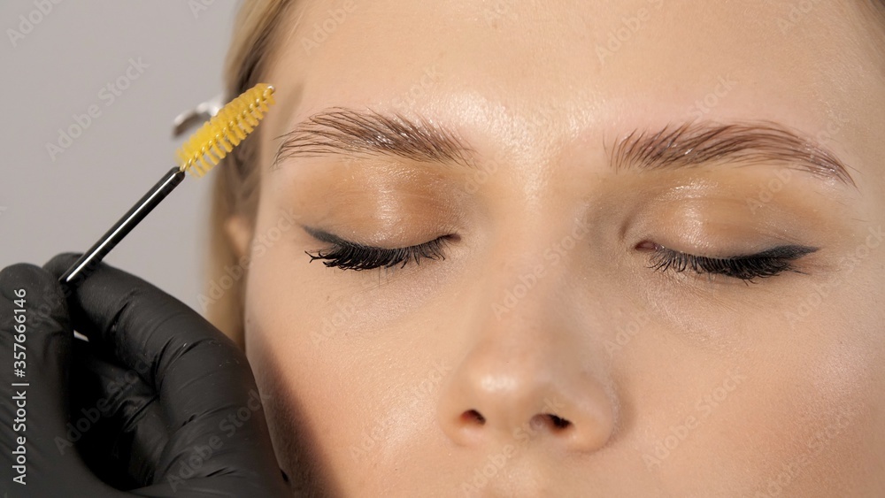 Stylist does professional makeup for beautiful woman at the beauty salon. Gloved master combing patient’s eyebrows with a special brush. Eyebrow shaping with a cosmetic brush close-up.
