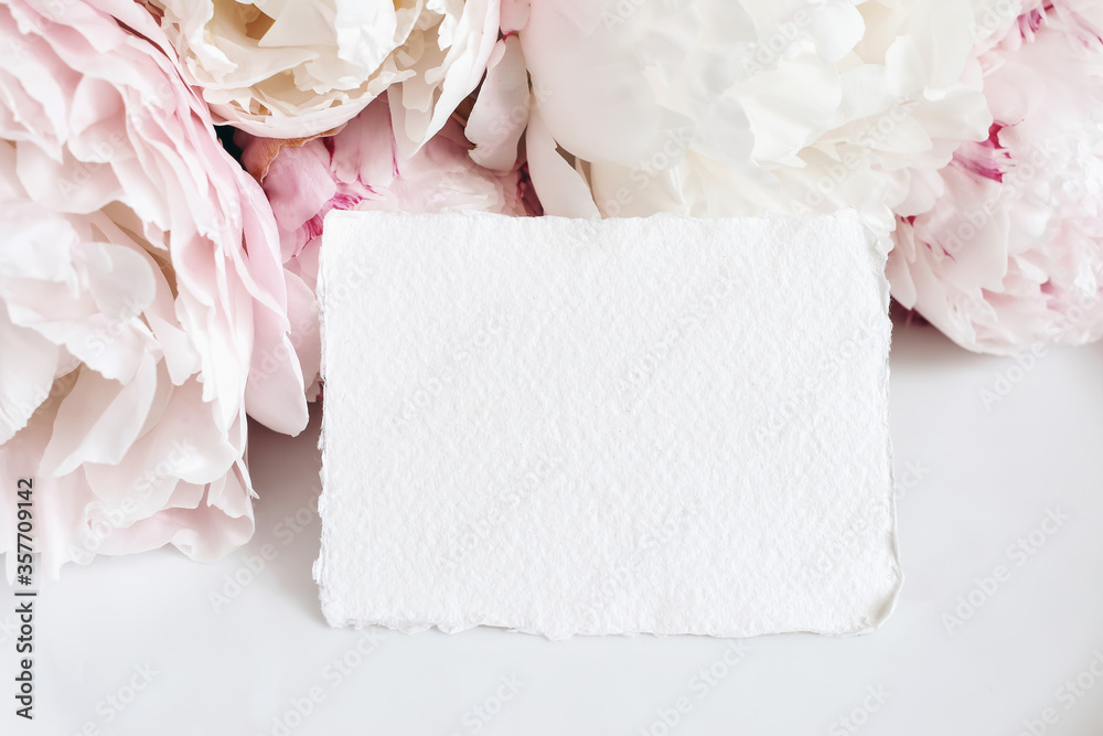 Feminine wedding, birthday mockup scene. Closeup of blank cotton paper card, invitation on pink floral petals and table. Peony flowers, blossoms. Spring floral, composition. Flat lay, top view.