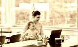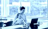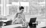 remote job, multi-tasking and family concept - happy smiling mother with baby and laptop working at home office