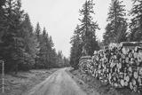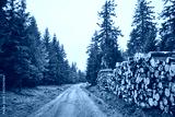 Log trunks pile by a road in forest on a foggy rainy day, color toning applied.