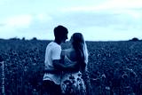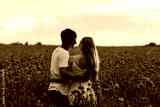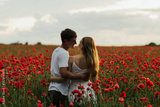 Young couple enjoying the time together in the red meadow. Young happy couple hugging on the poppy field. Couple in love. Beginning of a love story. Red flowers background. Copy space.