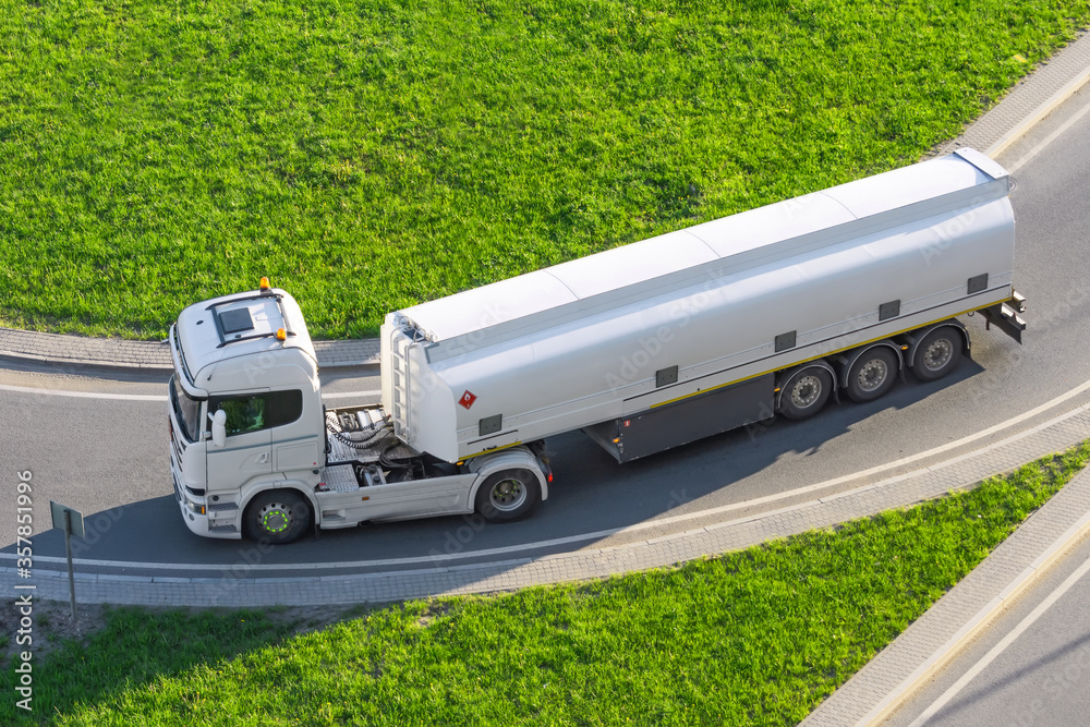 Powerful heavy white truck with a tank for flammable liquids rides turn on the road, close up view.