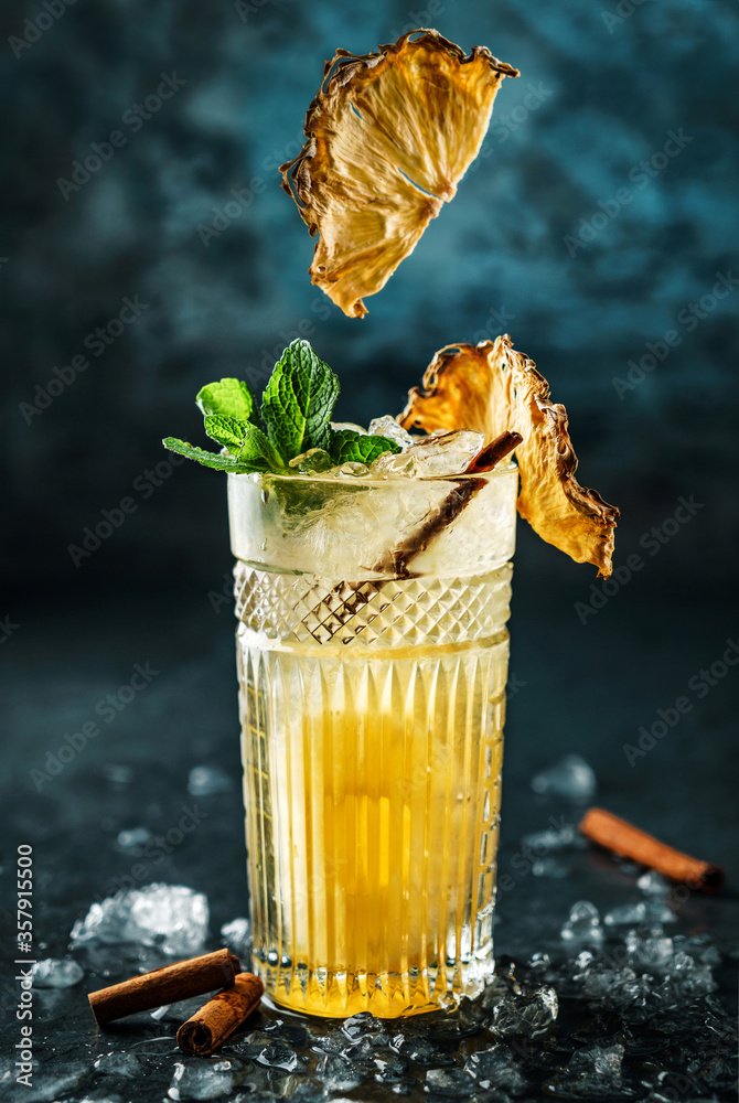 Fresh pineapple cocktail with cinnamon and ice in jar glass on dark blue background. Studio shot of drink in freeze motion, flying slice pineapple. Summer cold drink and cocktail