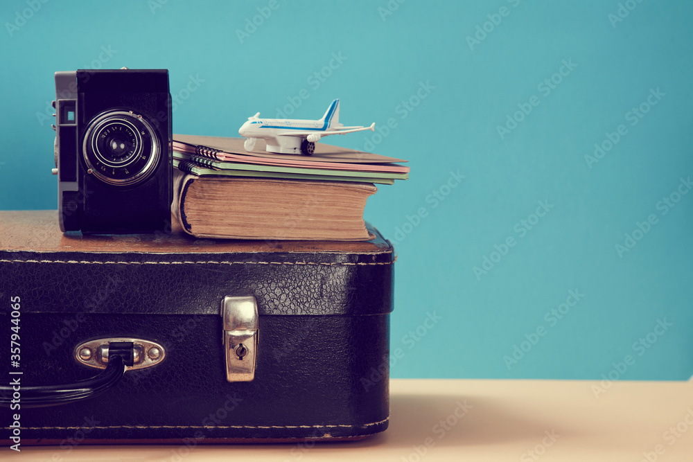 Traveler blog. Vintage travelling background. Blogging. Retro black travel case, old camera, book and model of plane