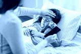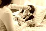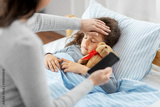 family, health and people concept - sick little daughter sleeping in bed and mother with smartphone measuring temperature with her hand at home