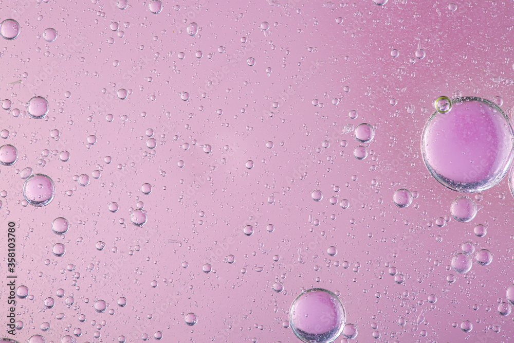 oil with bubbles on coral background. Pink Abstract space background. Soft selective focus. macro of oil drops on water surface. copy space. air bubbles in water