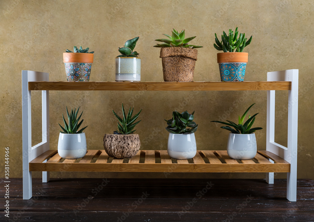 Green house plants potted on the wooden shelf