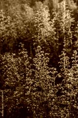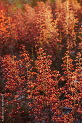 Abstract red small flowers plant background in sunset back light. Soft Selective focus. Vertical card. Light tender summer layout.