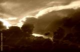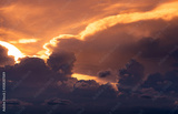 Sunset sky. Golden light shine in layers of clouds. Fluffy clouds at dusk. Twilight sky. God light. Cloudscape. Beauty in nature. Art picture of sky at sunset. Peaceful, hope and tranquil concept.