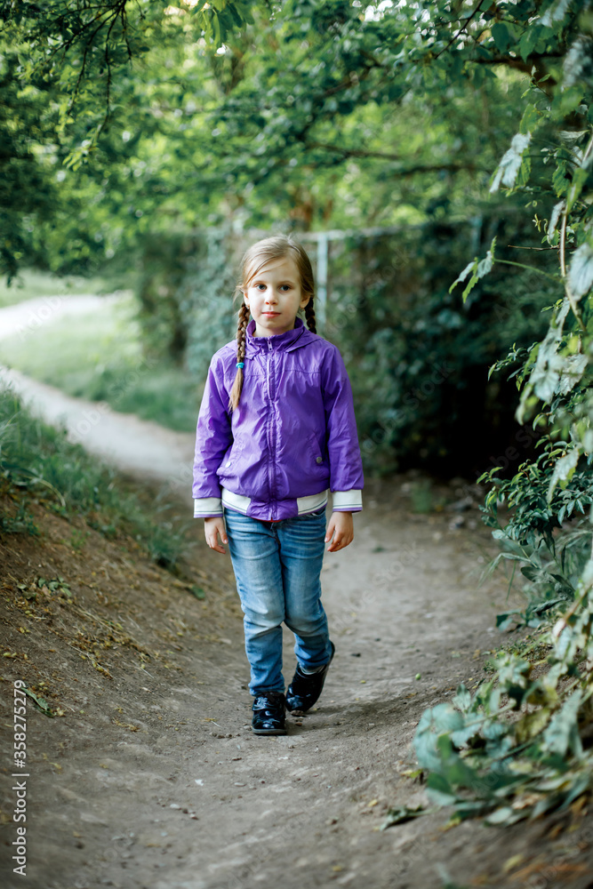 a girl in a light purple jacket with two pigtails is walking along a path among the greenery