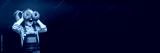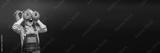 Happy cute girl is having fun played with donuts on black background wall.