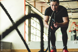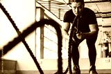 Attractive man in the gym with ropes doing exercises. Crossfit