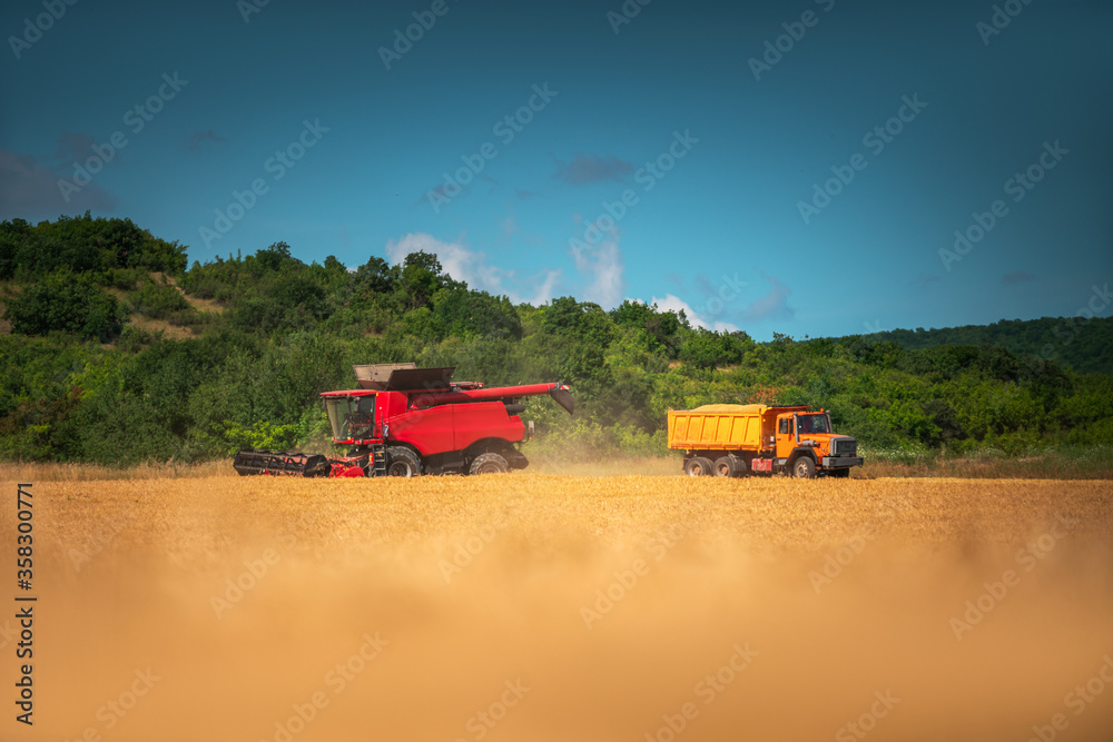 Combine harvester agriculture machine harvesting golden ripe wheat field
