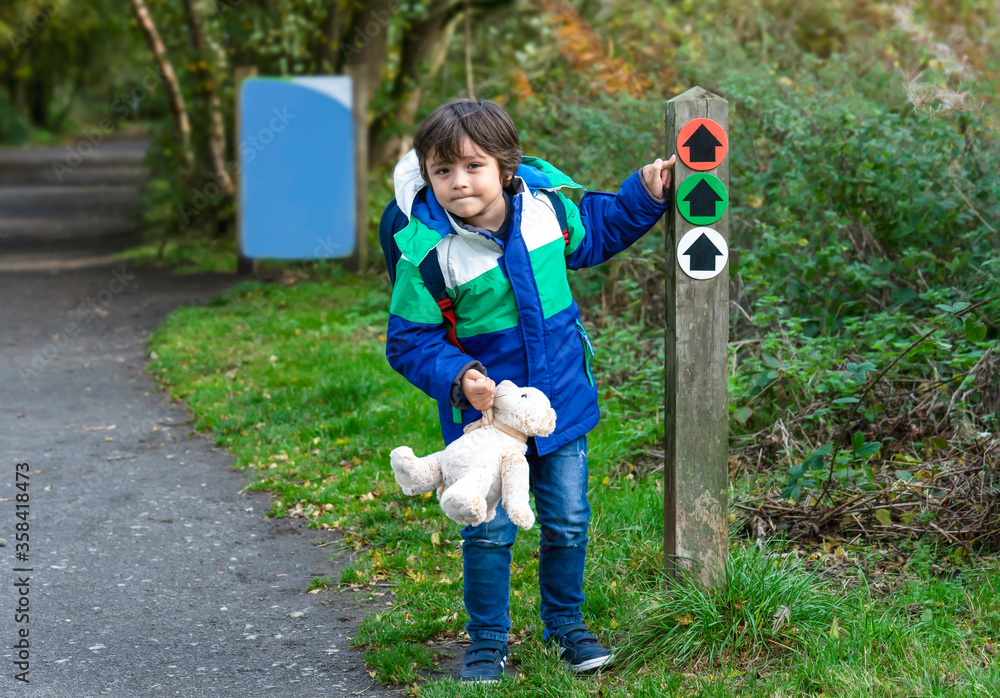 Outdoor portrait Kid holding teddy bear looking up pointing finger to direction arrow sign, Active child boy wearing raincoat taking bear toy adventure in forest for school trip. Education concept