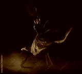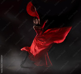 Flamenco woman spanish dancer in red dres performs with fan in dance at black background, studio shot