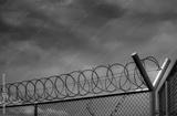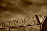 Prison security fence. Barbed wire security fence. Razor wire jail fence. Barrier border. Boundary security wall. Prison for arrest criminals or terrorists. Private area. Military zone concept.