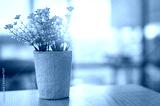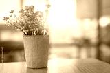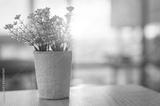 Fake white flowers with green leaves in recycled paper pot on brown wooden table in coffee cafe in the morning with sunshine. Plastic flower in pot. Home office interior and living room decor concept.