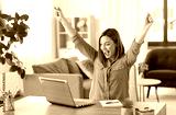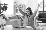 remote job, technology and people concept - happy smiling young woman with laptop computer working at home office and celebrating success