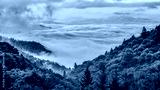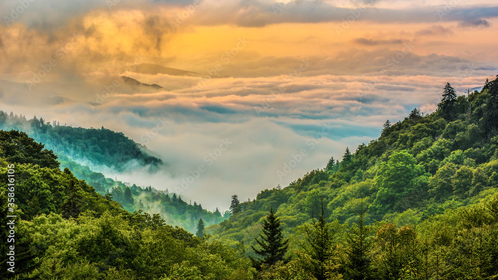 Fog coverd Great Smoky Mountains National Park at sunrise