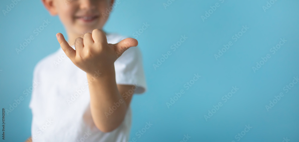 Little happy boy making a hang loose, Shaka hand sign. In studio blue background.