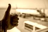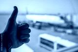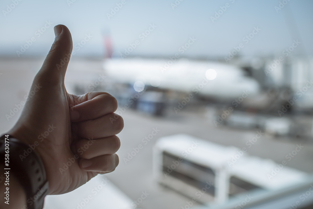 Safe travels by airplane concept. Hand with thumbs up with airplane