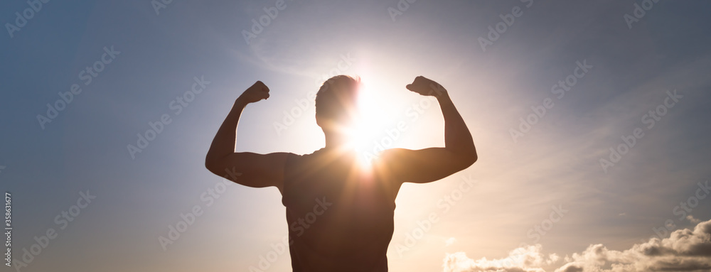 Strong man flexing silhouette. People health and fitness