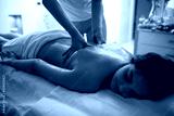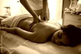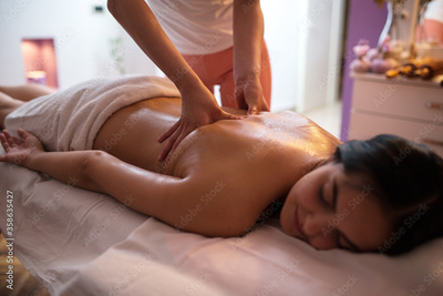 Young woman receiving massage in spa salon.