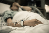 Young woman patient lying at hospital bed feeling sad