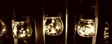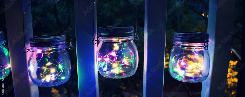 Mason Jar filled with neon LED lights inside, on an apartment balcony