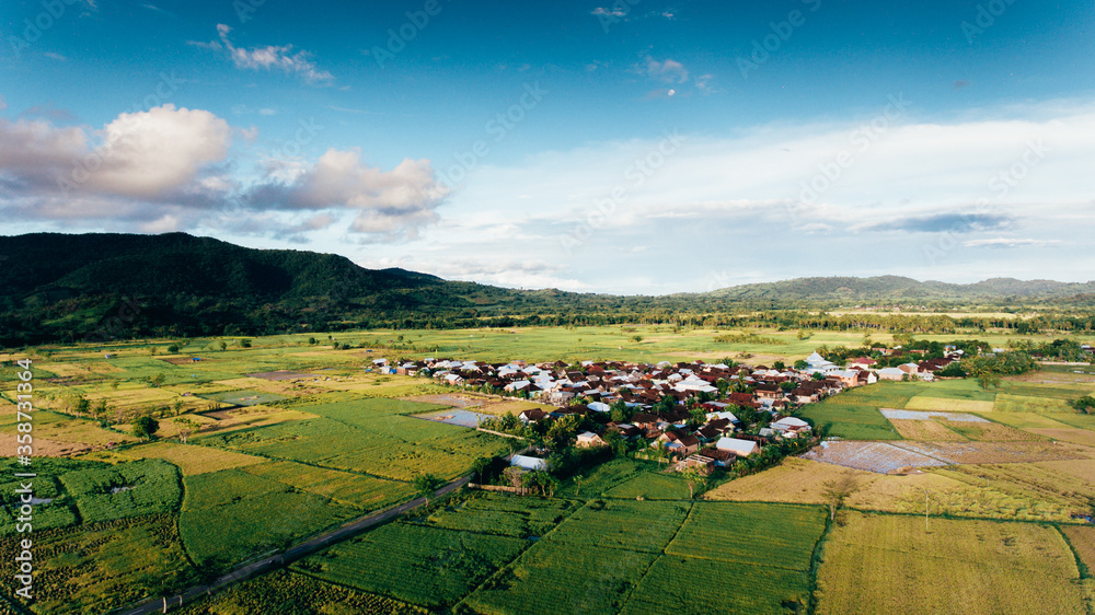 Aerial view of Songkar Village in Sumbawa, Indonesia. Small village in the midle of field rice