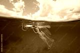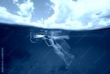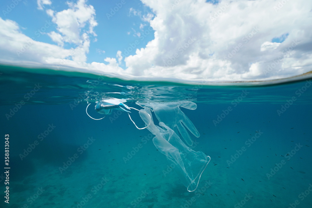 Plastic waste pollution in the sea since coronavirus COVID-19 pandemic, face mask with gloves underwater and sky with cloud, split view over and under water surface
