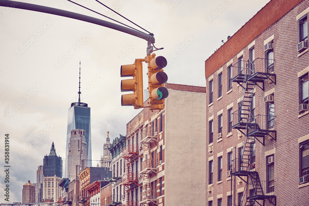Retro toned picture of New York City traffic lights, selective focus, USA.
