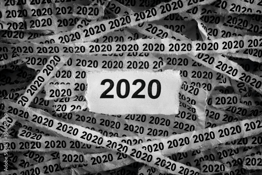 The year 2020. Torn pieces of paper with the numbers 2020 on them