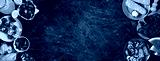 BBQ or summer picnic food double side border over a dark stone banner background. Various grilled meats, vegetables, fruits, salad and potatoes. Top down view with copy space.