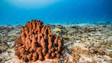 Seascape in turquoise water of coral reef in Caribbean Sea / Curacao with fish, coral and Tube Sponge