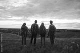 A group of people tourists stand at sunset on the nature.