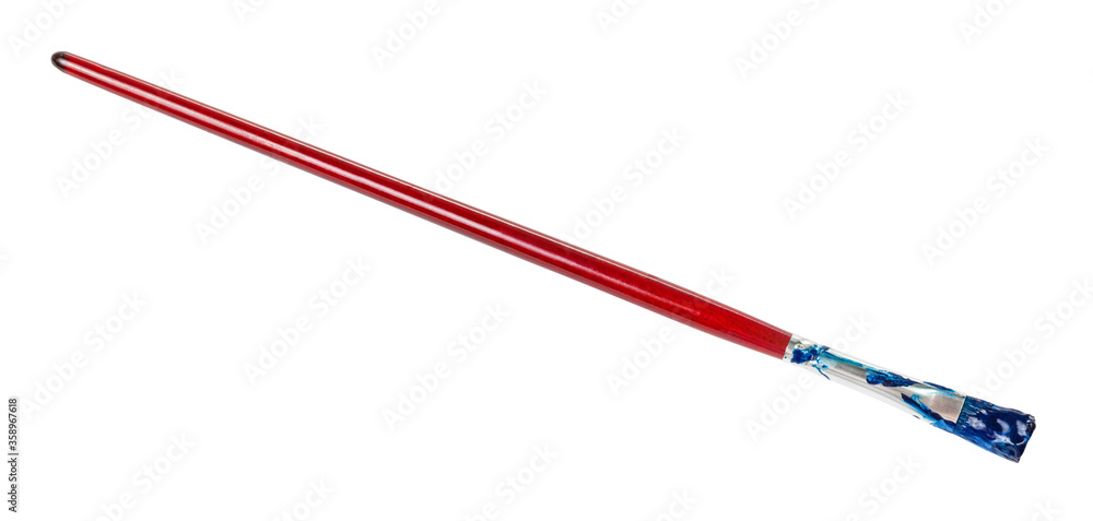 flat paint brush with blue colored tip and brown handle isolated on white background